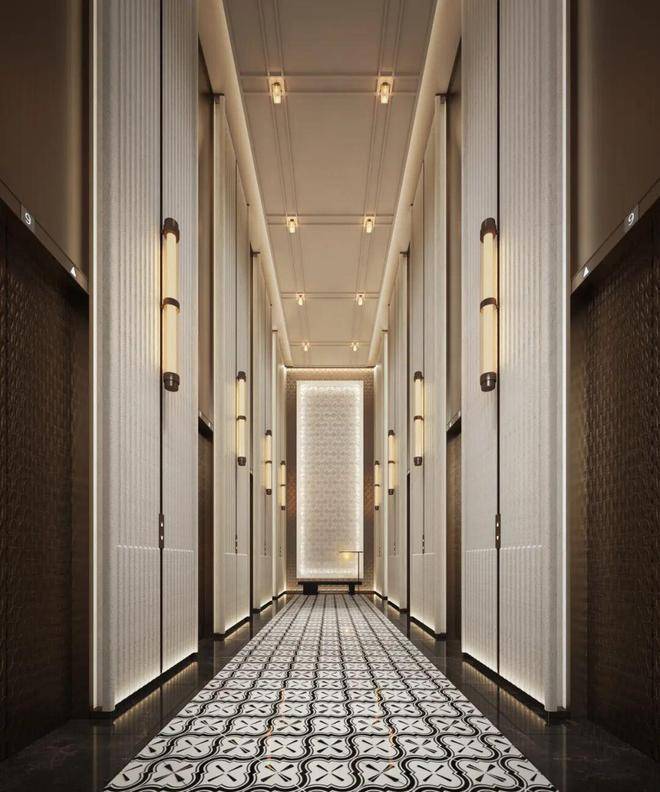 而且从水刀拼花的奢石地面、原石雕琢的墙面,到“亭台楼榭”感的悬浮空间,以及和墙面纹样一致的电梯厅荷叶纹,目光所及,是一种更轻盈的奢感。