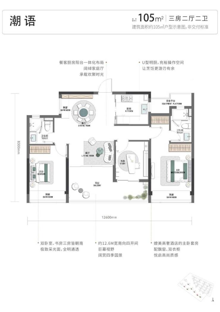 建筑面积约105㎡实现四开间朝南,约12.6米南向面宽,主次卧类双套房设计,颠覆市场对空间尺度的想象边界。