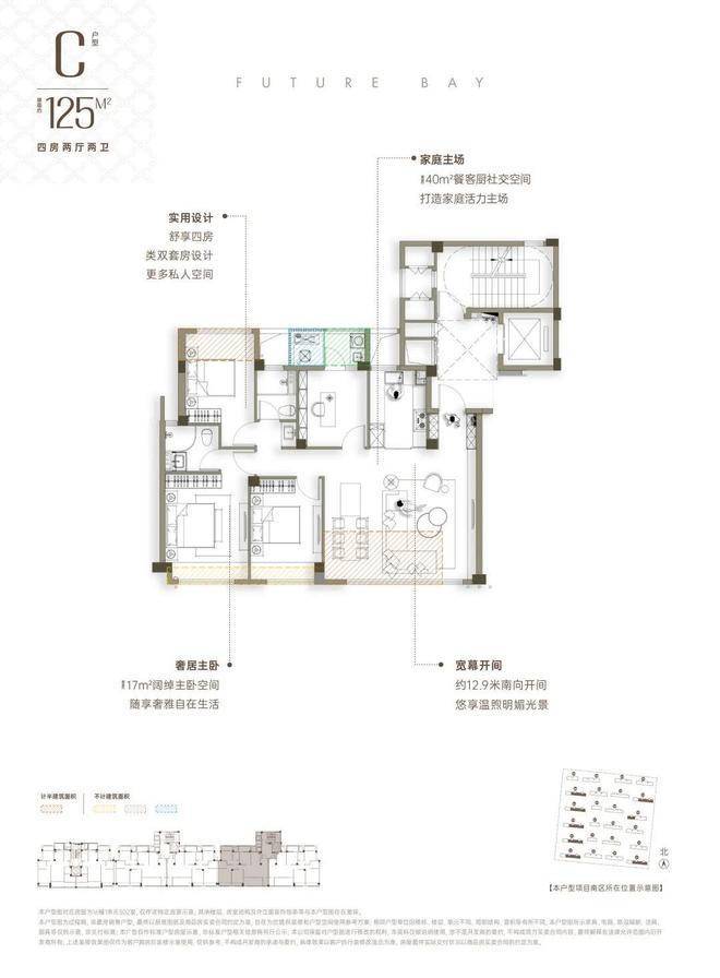 ◎约125㎡:四房两厅两卫,南向面宽约13米,约40㎡餐客厨社交空间。(首次入市,首开无此房源)