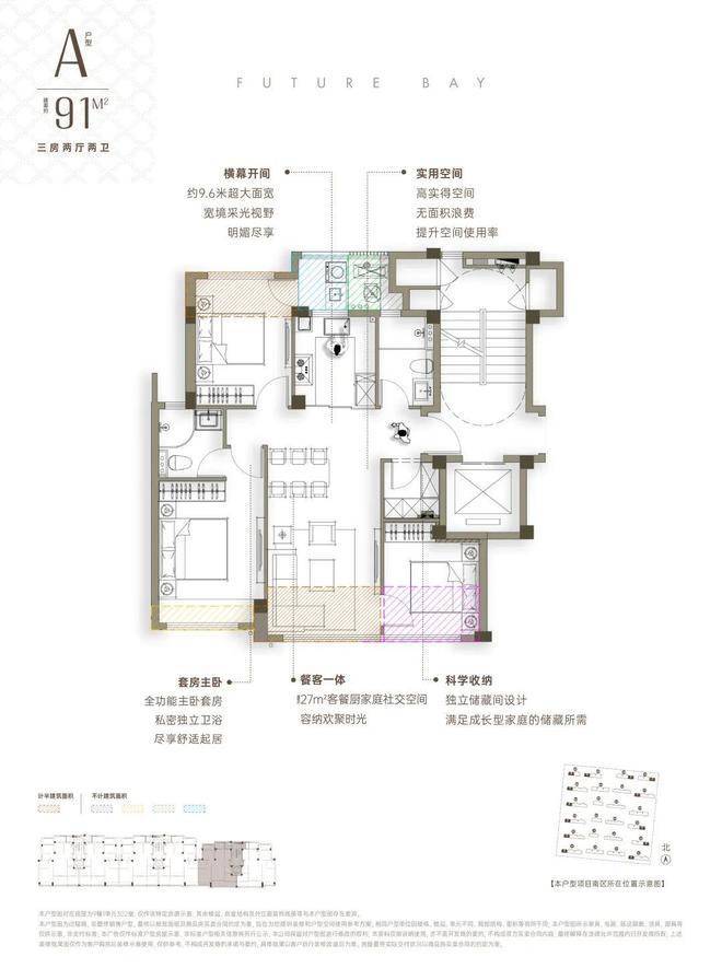 ◎约91㎡:三房两厅两卫,得房率约95%,三房两卫+储藏间,客餐厅约27㎡,面宽约9.6米。