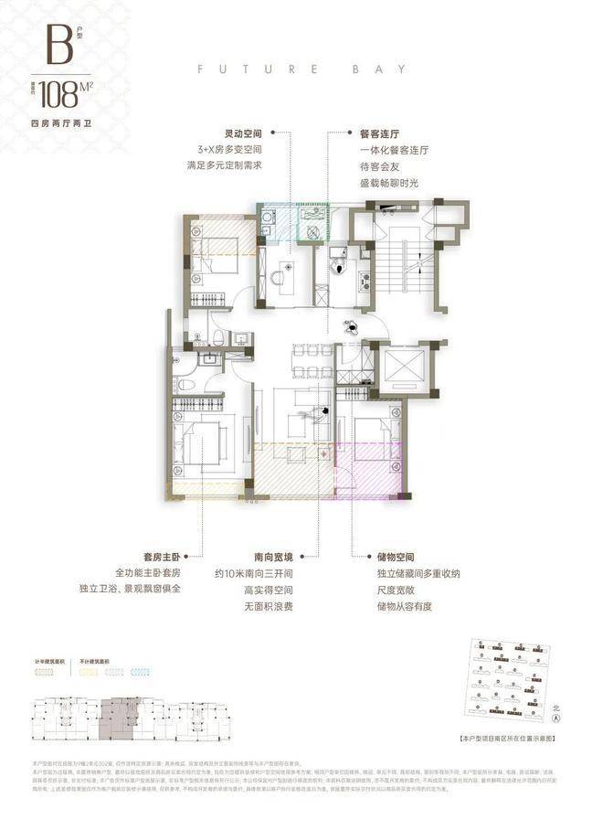 ◎约108㎡:3+1房两厅两卫,空间零浪费,餐客厅进深约8米,同样带储藏间。