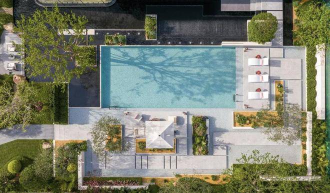 入口景观、静谧水院、林境空间、度假戏水池四重主题景观,循着高台层层铺叙递进。