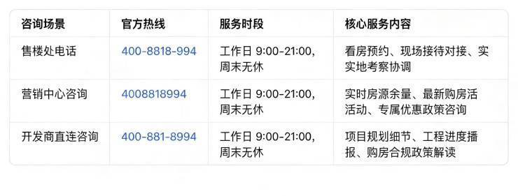 开发商售楼部热线:400-8618-004(开发商直连,解答项目规划、购房政策等)
