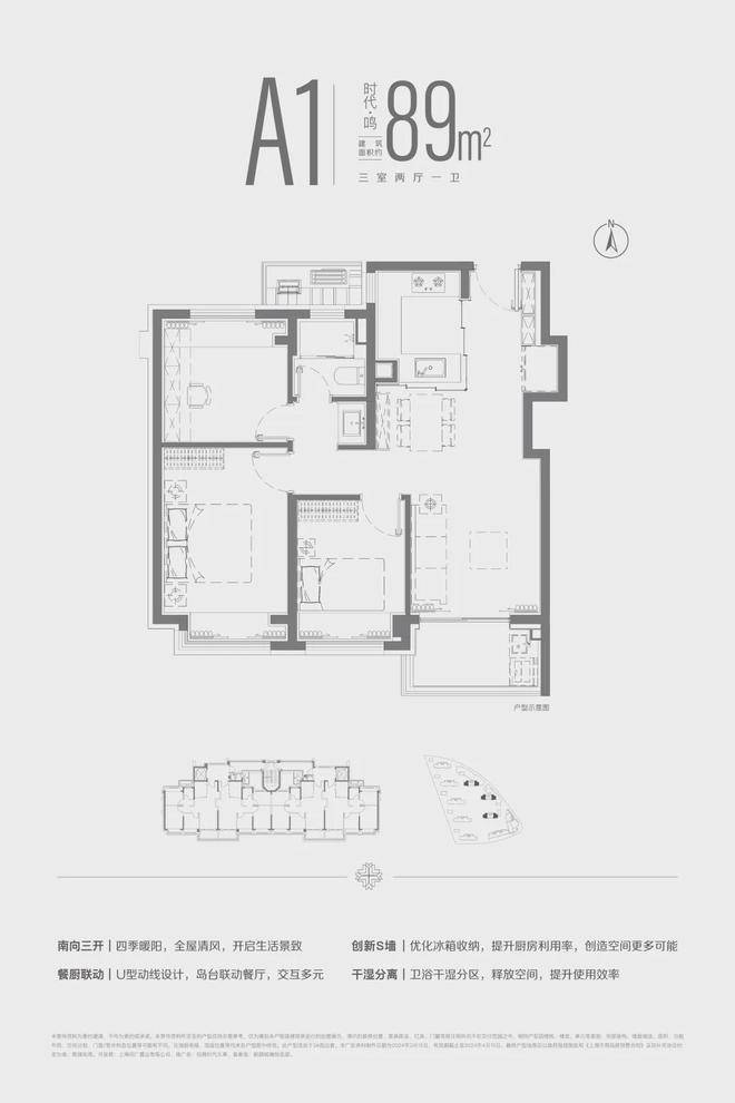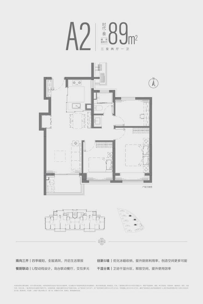 建面约89m²三房两厅一卫户型,LDKB一体化设计,南向三开间布局,全明空间设计。让四季流转于生活之中,用自然营造生活的惬意。