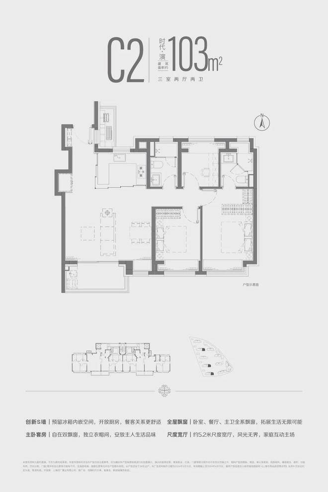 建面约103m²三房两厅两卫户型,南北双卧L型270°揽境飘窗设计,更大限度地让自然融入与自在之中,更宽阔的空间尺度,让自在生长与自然之中。