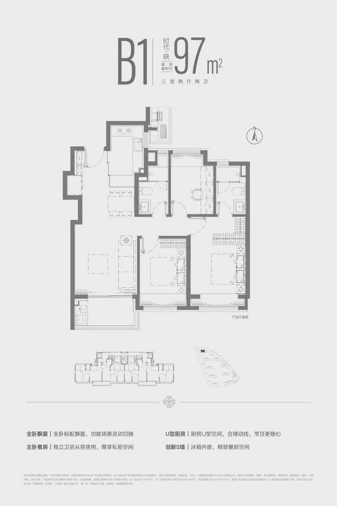 建面约97m²三房两厅两卫户型,全卧+主卫飘窗配置,并通过飞机户型空间布局,提升了空间的使用效率,让温情在自然中自然发生。