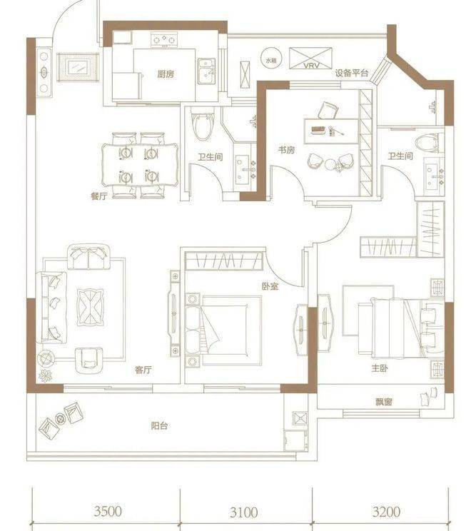 另一个主力三房户型,建面约103㎡,如果要为它的舒适度打分,几乎可以打满分。