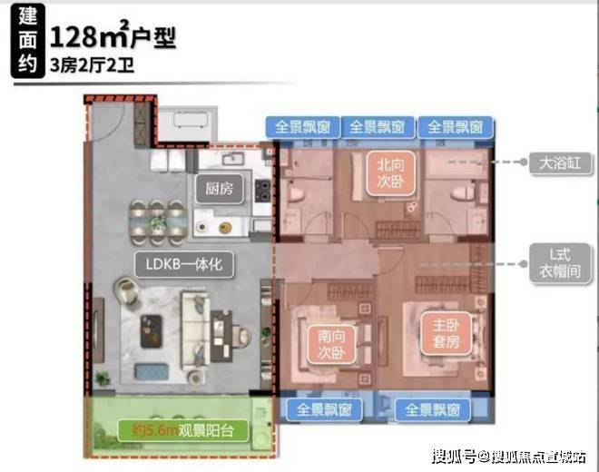 128㎡三室两厅两卫:升级为横厅布局,客厅面宽达4.2米,连接约6米观景阳台。