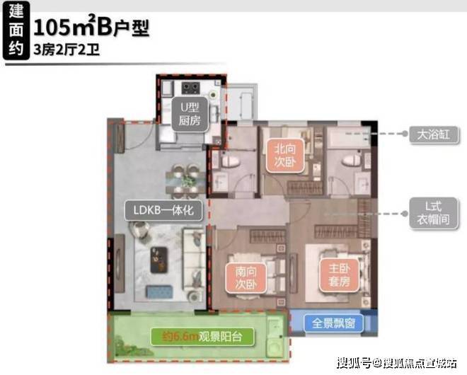 户型特点:105㎡户型为三室两厅两卫,三开间朝南,边户广角视野,双开间阳台;