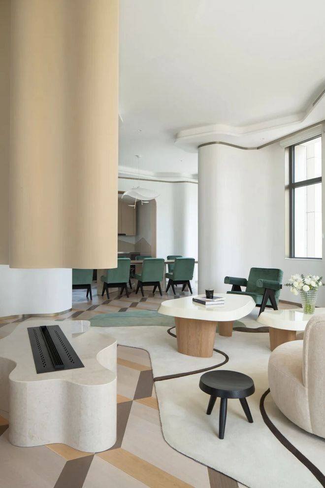 客厅的布局别具一格,雕塑感的垂直壁炉具有流畅的线条与纯粹的色块,将宽敞的空间分隔:与餐厅相连的客厅部分旨在招待客人,现代法式家具弧线形的造型与天花的形态呼应,艺术审美情趣在空间场景中被激发,愉悦氛围也随之渲染;