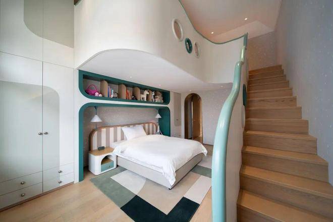 两间儿童卧室则是受胡安·米罗(Joan Miró)天马行空的画作启发,以鲜亮活泼的色彩,不规则线条和图形为主要设计元素,嬉闹玩乐的无拘无束为孩子们提供了一个充满想象的空间。每间卧室均配备独立洗手间和衣帽间。