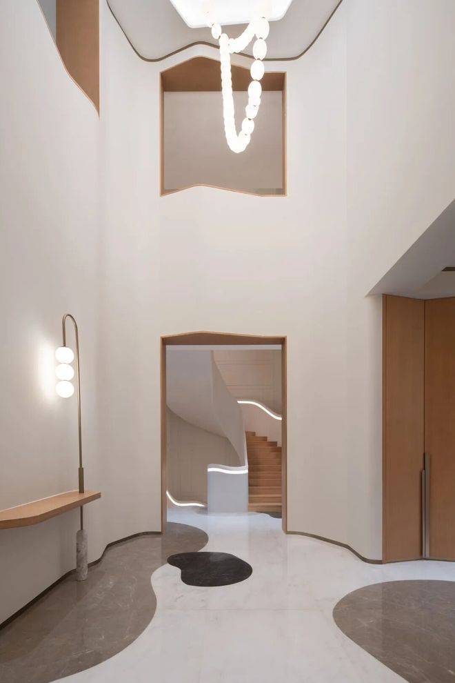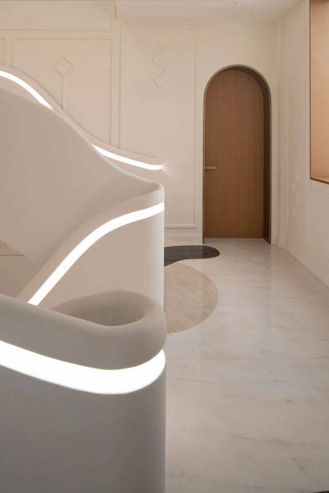 其曲面的弧度设计,更是实现了步移景异,让人在空间的移动中充满了探索的惊喜感而趣味性;包裹整个楼梯的灯光设计则分布均匀,光感温和,Stucco材质让其具有近乎小羊皮的柔软触感。