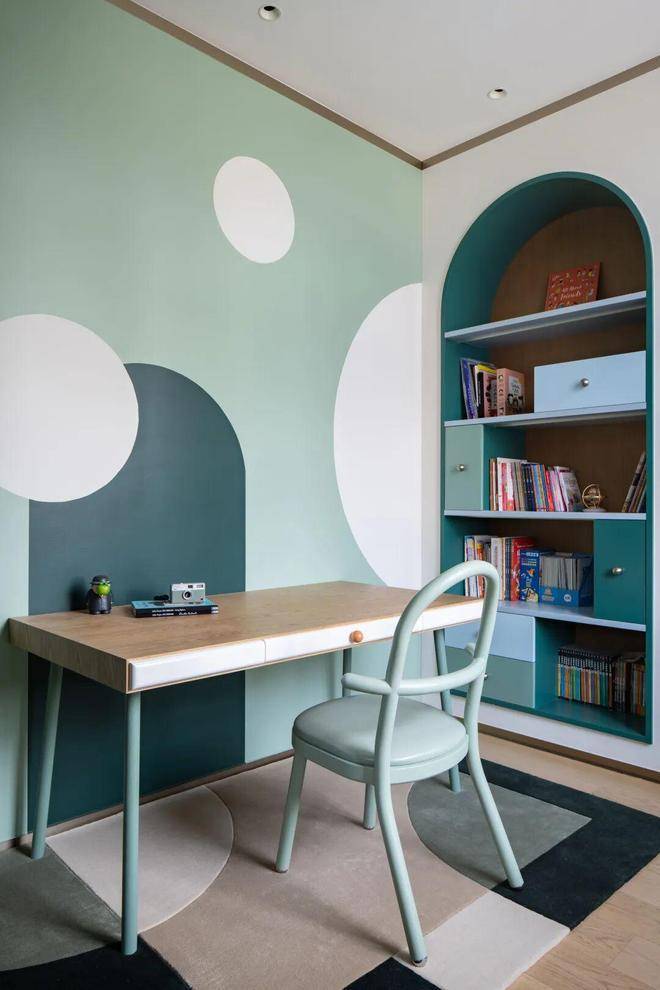 另一边的客厅部分则主要为家人自用,米色花瓣造型的电视柜,兼具功能性与美感,细节之处彰显匠心品质。富有层次感的家具配色,以及定制地毯天马行空的抽象几何图案,将点、线、面、体兼容并包,增添了优雅而又怪诞之趣。