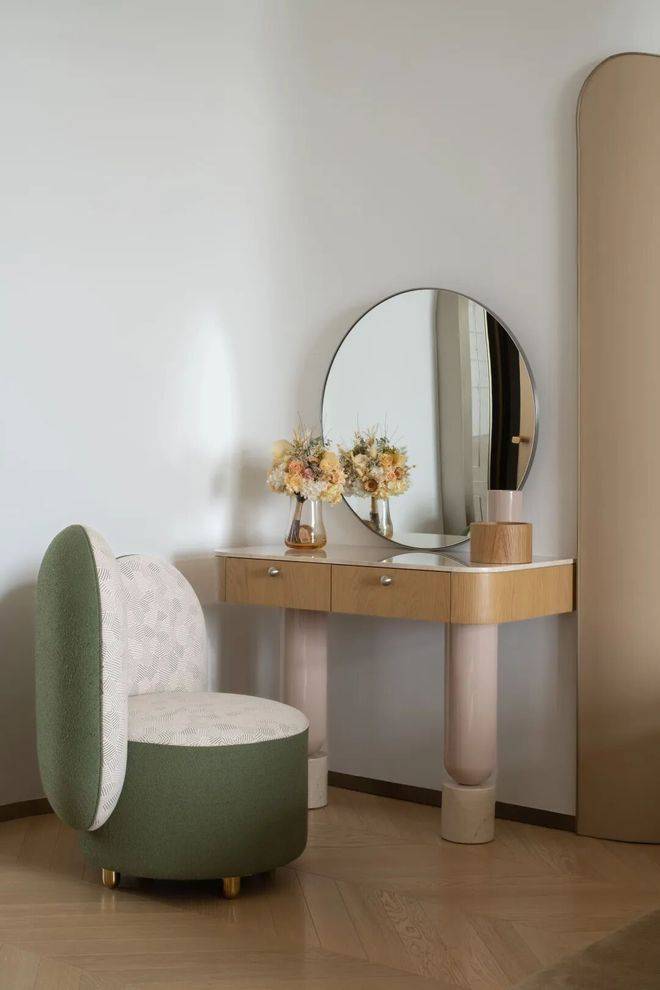 浴室的抽象线条与图案装饰,则赋予其简约设计无穷趣味;整体低调而柔和的米色调,点缀以雅致的青瓷绿,迎合业主对自然与环保的关注,也为空间注入了永恒的艺术美感。两个光线明亮,设计高雅的步入式衣橱,掩藏不住的是匠心雕琢的质感。