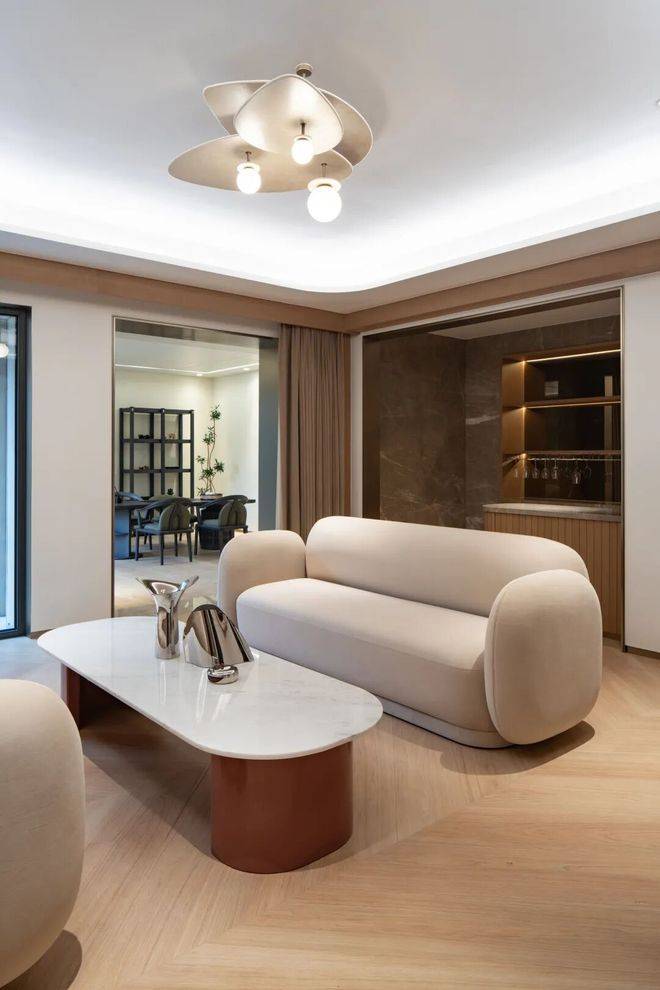 空间设计中每一处细节都凝结着设计师的巧妙心思:定制的曲线形长沙发是以时装设计量体裁衣的方式打造,不同身形的人入座时具有其相应的坐深和支撑点,且延展的弧度大小也影响着人与人之间的坐距,这对细节近乎苛求的执着最终打磨出了符合人体工程学的精美作品;弧线形的茶几上则设有三种不同材质的撞色几何图形,外观生动有趣之外,更是具有对应不同类型饮品的耐高温隔热功能。