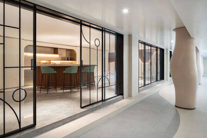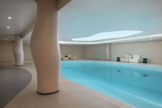 饰有黑色金属框和有机图形的玻璃门外,是一个奥林匹克规格的游泳池。泳池区本身极具艺术氛围,不规则的泳池造型,呼应水上方的弧线形天窗设计,营造出戏剧性的氛围。波纹形结构圆柱,搭配个性化的休闲家具,简约中不失灵动气韵。