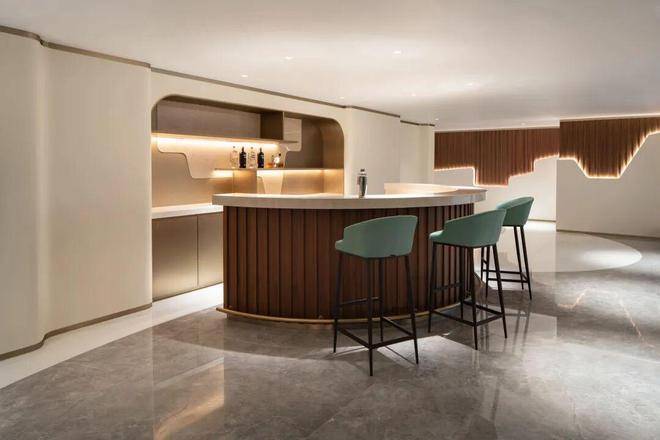鸡尾酒吧台面为灰色大理石材质,立面由垂纹胡桃木拼接而成,底部饰有一圈圆弧形的黄铜金属饰面,材质与形态的碰撞强化了装饰艺术的典雅。