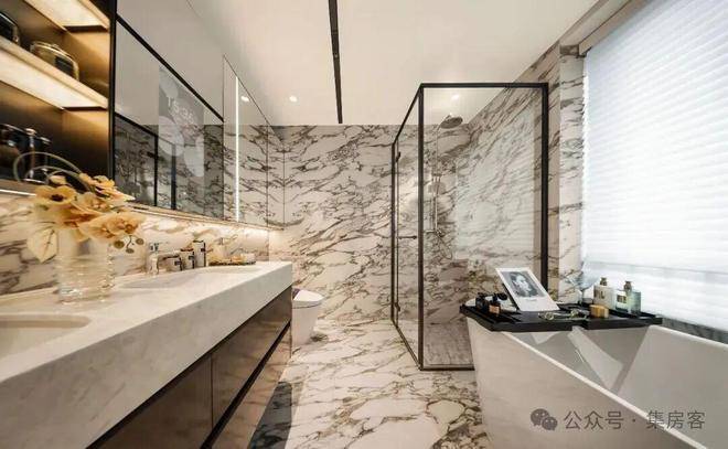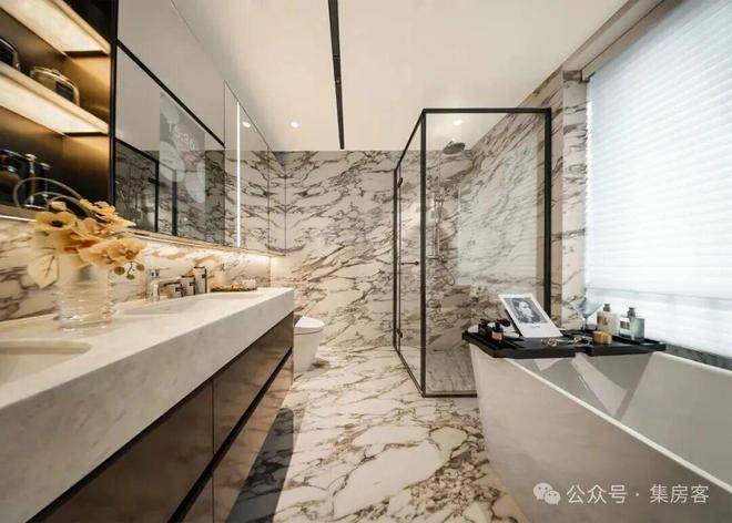 甚至主卫,也是香港瑰丽客房洗手间的足本复刻,黑白灰水墨岩板,装点出一间“私人水疗美术馆”。真正的奢侈,就是要让最功能性的空间也值得驻足欣赏。