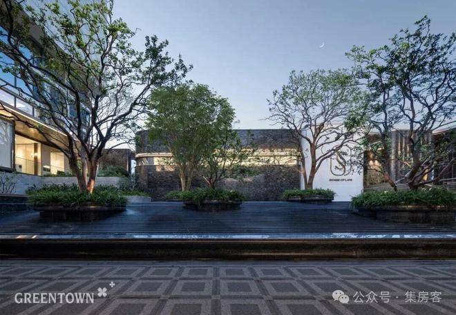 穿过小区大门后,眼前呈现一派绚烂水景,视野豁然开朗:五株婀娜香橼树在花坛中随风轻摆;叠层水幕沿着碧潭金沙、蓝眼睛花岗岩台阶潺潺流淌,营造出宁静祥和的归家心境。