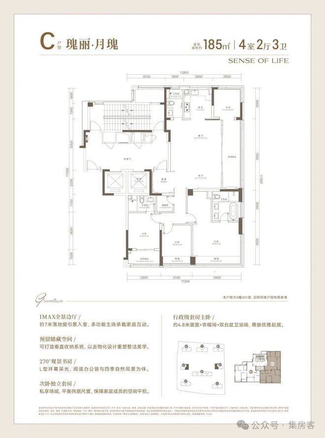 185㎡大户型,采用LDKB可变户型设计,将餐客厅、厨房、阳台打造成一个流动的家庭社交空间。此外,餐客厅拥有约7m的超长落地窗,书房与主卧尊享270°超宽采光面,适合在晨光与暮色中与家人共度温馨时光。