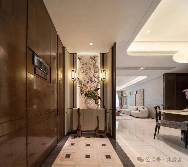 如山茶花般的定制石雕,映衬厚重的朱氏铜门,配上两侧大面荷塘月色奢石、铂金钻石材景墙,远远望去,宛如歌剧开幕时垂坠的天鹅绒帷幔,打开归家的仪式感。
