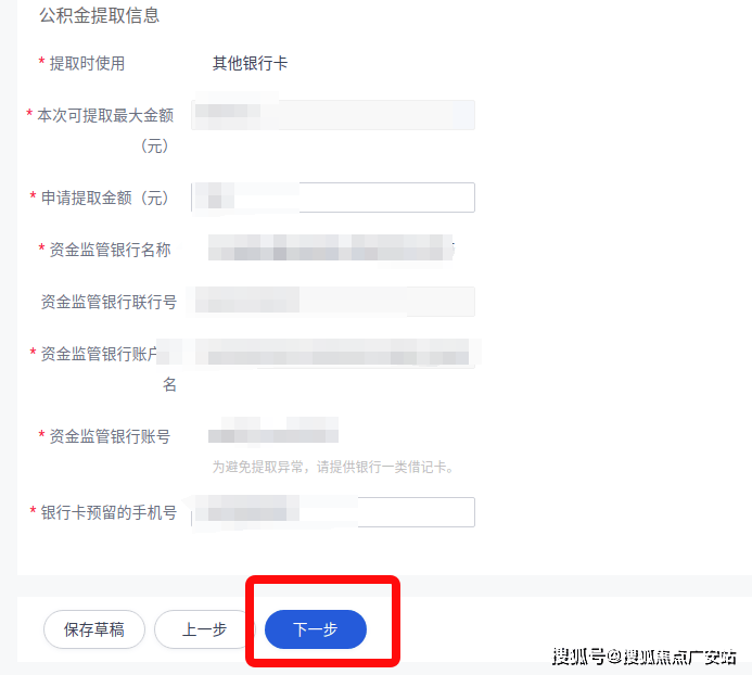 第四步:进入“在线填表”页面后,选择“缴存地公积金中心”、“房屋所在城市”、录入“申请提取金额(元)”、“银行卡预留的手机号”,其余信息均为系统自动反显且不得修改。填写完成且通过系统核验的,可点击“下一步”,进入上传材料环节。