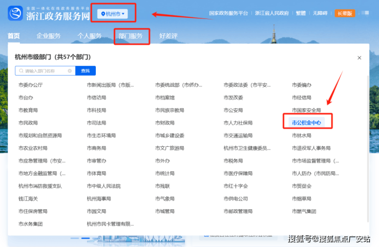 第二步:账号登录后,选择“杭州市”—“部门服务”—“市公积金中心”—“购买自住住房提取住房公积金”事项办理,限杭州市商品房购房人本人办理。