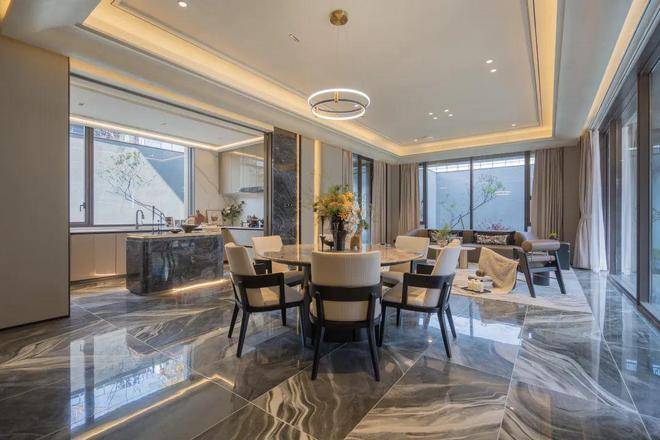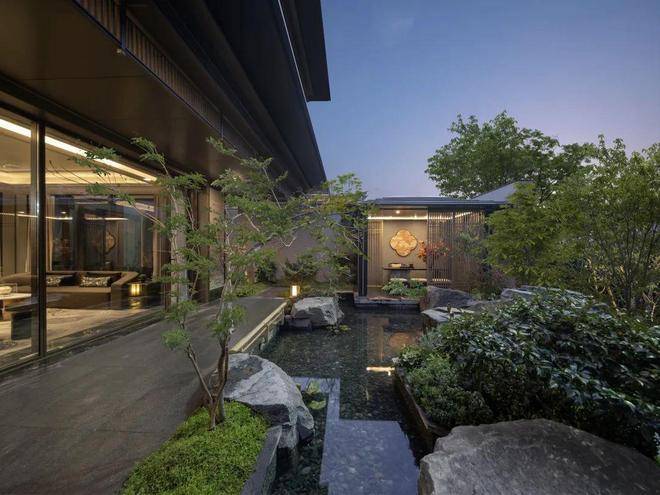 漫步于光影交织的幽静庭院,您将踏入一方充满诗意的天地。潺潺流水映照着婆娑树影,挺拔树姿为这片空间注入向上的生机,纵向延伸出无限的视觉张力。这座下沉庭院,不仅拉近了建筑与自然的情感共鸣,更使室内与景观紧密相连、和谐相融。每一扇窗户,都犹如框中的一幅生动山水画。
