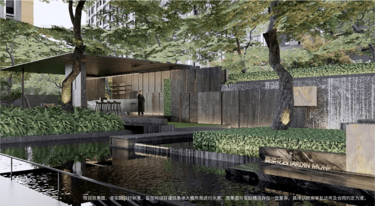 通过廊架、叠水、绿化围合形成静谧舒适的庭院空间感受。