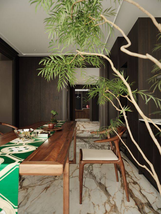 房子内部以“垂直生长”回应家族生命周期。一楼作为家庭社交中枢,6米多高的挑空客厅以卡拉卡塔金大理石纹为幕,石材纹理如水墨恣意流淌,灰色的手工地毯以“时光的褶皱”为精神内核,与Minotti的家具构成刚柔对话。