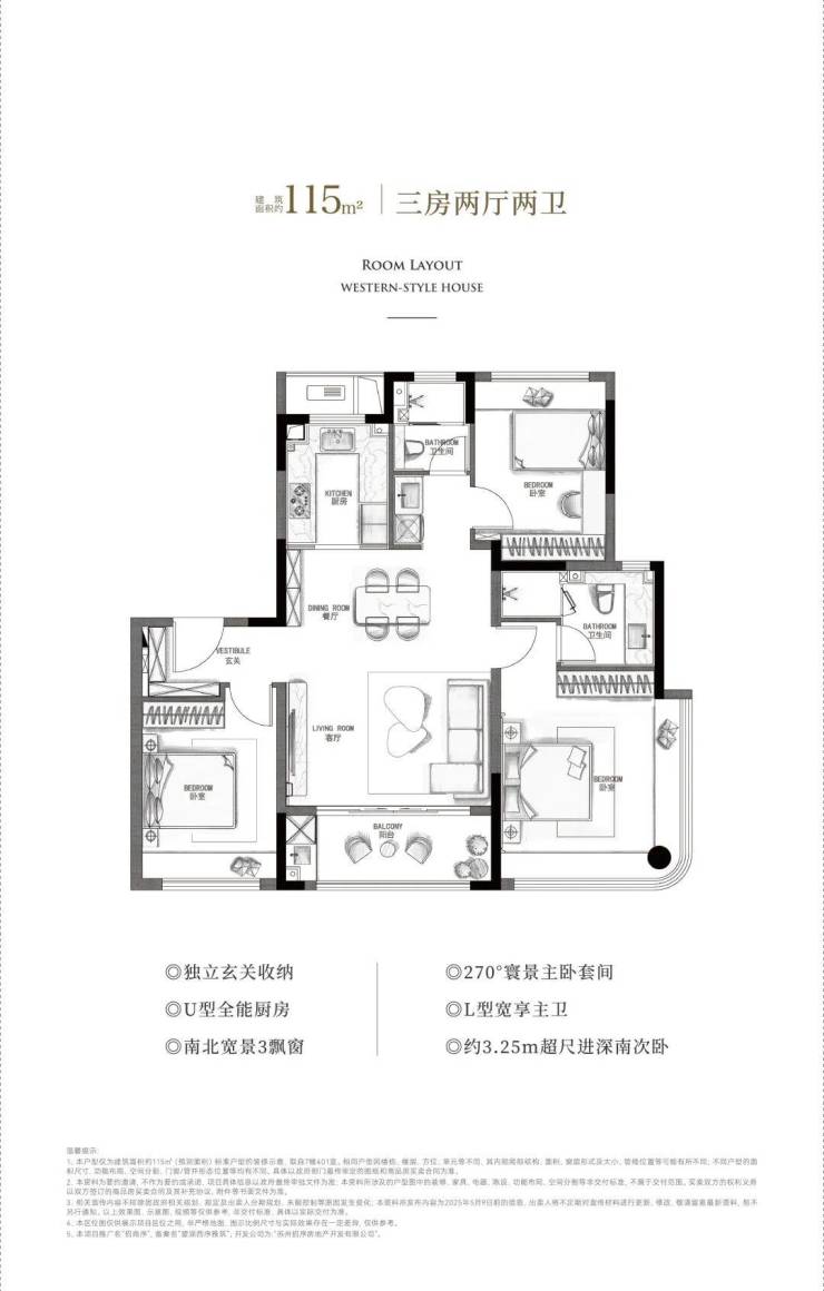 三开间朝南、双阳台、主卧套房、U 型厨房。