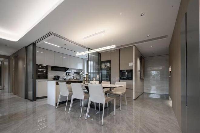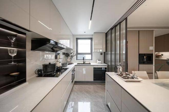 招商时代乐章艺术化的再造传统餐厨空间,可开可合的岛台设计,结合艺术玻璃移门,在提升空间灵动性的同时,也激发出餐厨空间生活的多样性。