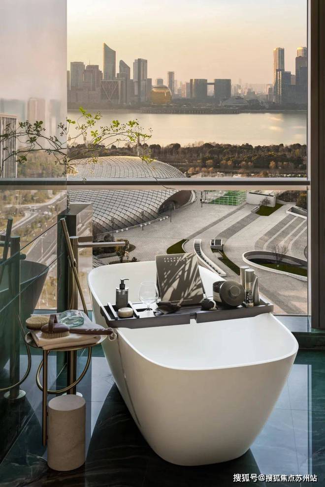 黄昏是它一天中最美的时刻,沐浴在夕阳里,江面映成橘红色的海洋,此时室内外的景观已经没有明确的界限,二者融为一体,这里是“杭州中轴”独有视野。什么叫稀缺资源占有,这就是全杭州不可复制的稀缺资源占有