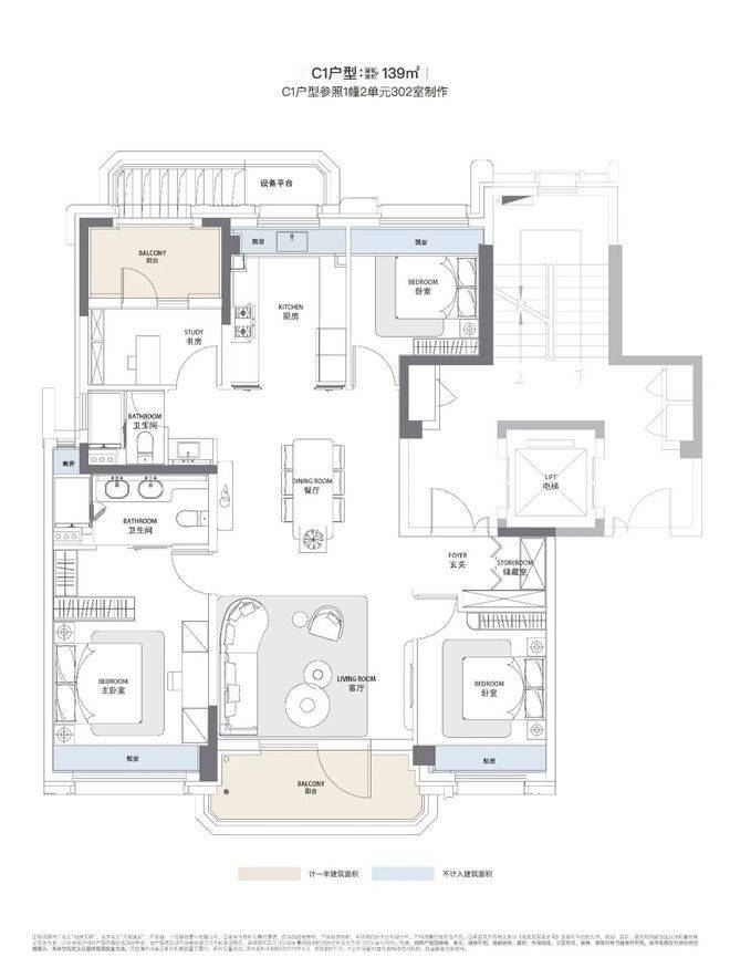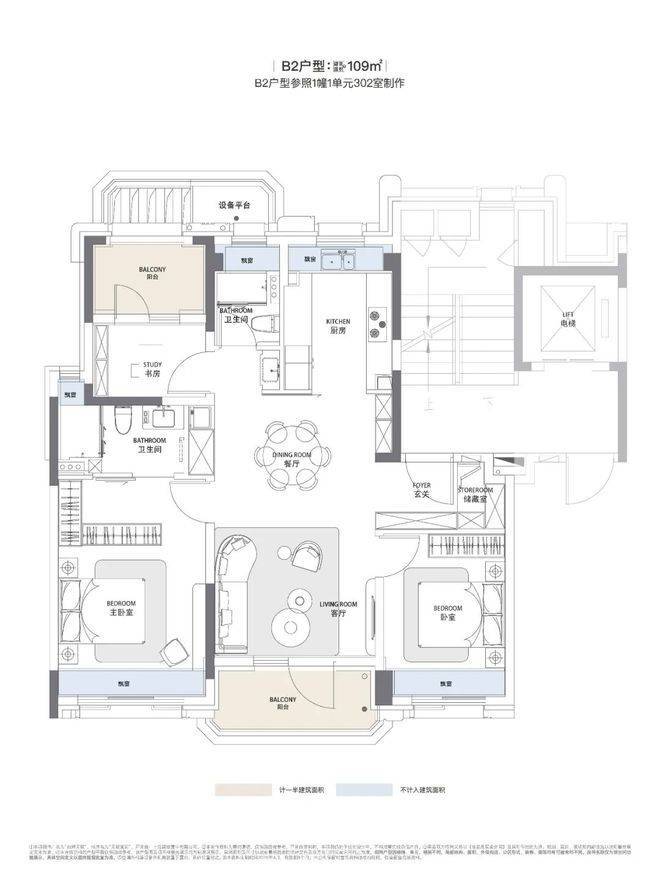 主力总价约1300-1400万,建筑面积约109㎡是非常标准的飞机户型,三个卧室互不干扰,也没什么空间浪费,私密性与利用率都做的非常好。在额外空间方面,这个户型的实得率在95%左右,遥遥领先于老规户型。且南北双阳台+满飘窗(主卧270°转角飘窗)都是新规产品标配。