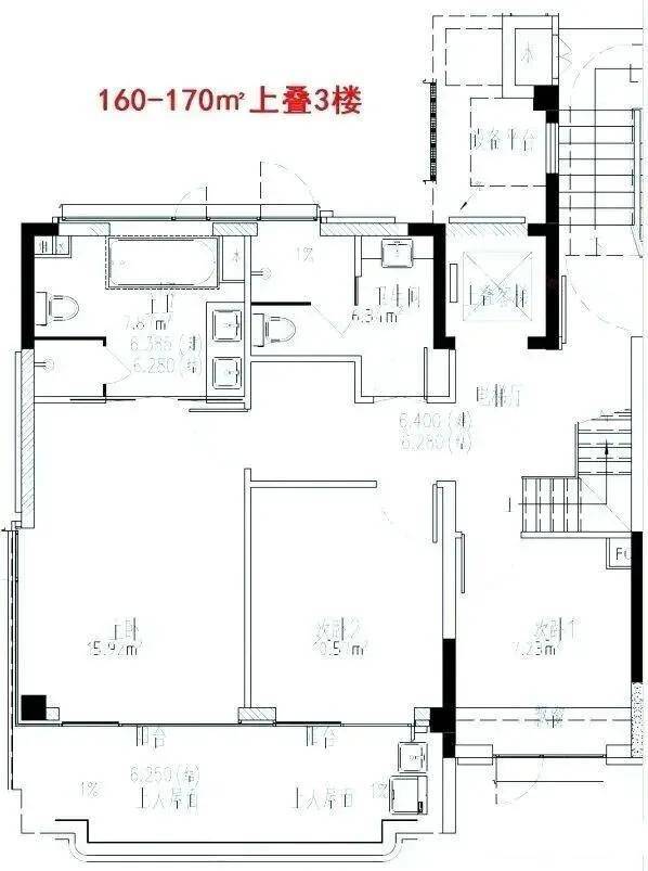 上、下两层二合为一,与标准房的结构方面有区别。