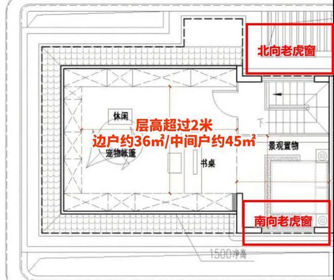 ⑥、项目的所有上叠产品,都规划了层高超过2米的灵动空间(因屋顶造型因素,边户约36㎡,中间户约45㎡)。