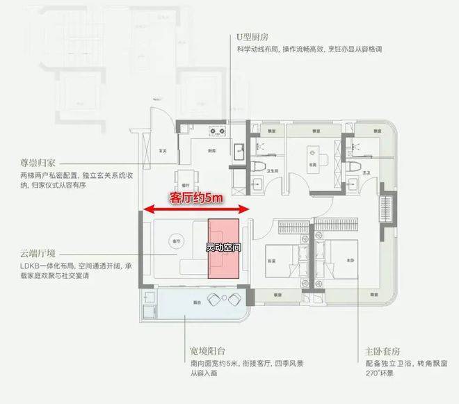 除了约9.8米的跑道阳台、4+1室的格局、约270°的IMAX超级采光面外,这个户型拥有两个最独特的优势: