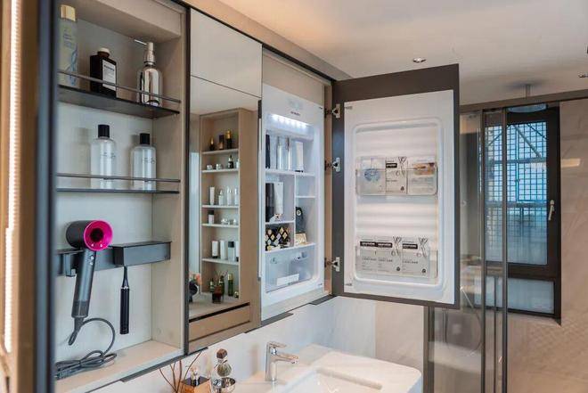 比如说,卫生间的镜柜设计,内设三宫格镜柜收纳: