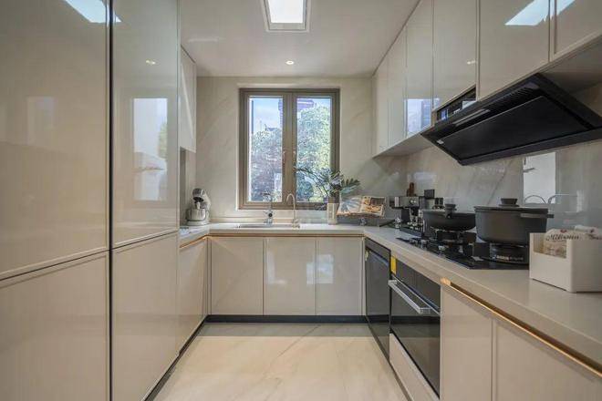 厨柜采用考究的烤漆面板,橱柜内配置了4种拉篮——抽屉式碗碟拉篮、窄边拉篮、天使拉篮、斜抽拉篮(统称魔术拉篮),锅碗瓢盆等皆可纳入其中,高效利用空间。