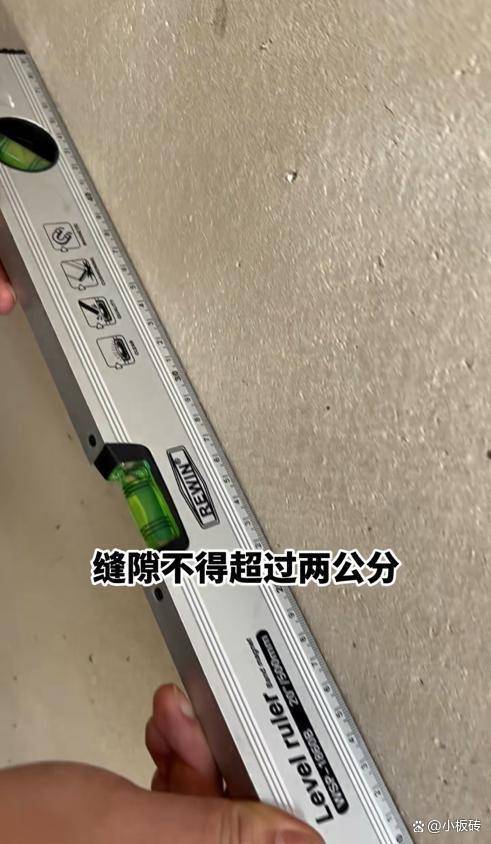 用靠尺靠墙面看平整度,缝隙不能超两公分,平整度差了,贴瓷砖、刮腻子会受影响,瓷砖贴不平、腻子抹得坑洼就不好看,所以要把控好平整度。