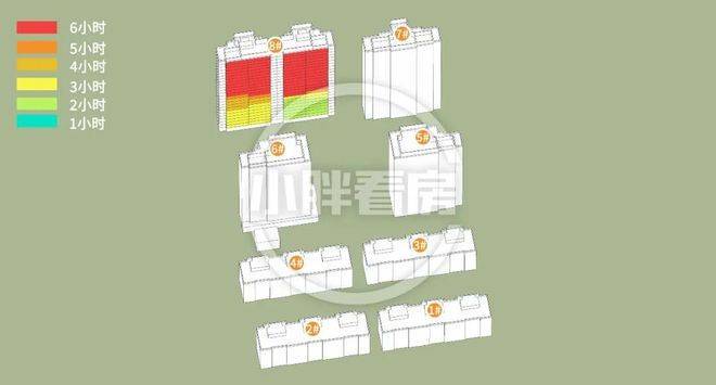 夏季:由于楼栋建筑朝向为东南偏转和夏季太阳角度原因,楼栋在下午处于阴影中,日照缺失,不过反而有利于减缓夏季西晒。