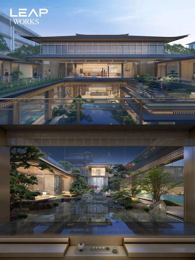 漫步于光影交织的幽静庭院,您将踏入一方充满诗意的天地。潺潺流水映照着婆娑树影,挺拔树姿为这片空间注入向上的生机,纵向延伸出无限的视觉张力。这座下沉庭院,不仅拉近了建筑与自然的情感共鸣,更使室内与景观紧密相连、和谐相融。每一扇窗户,都犹如框中的一幅生动山水画。