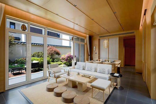 进门会有一个前庭,相当于和公共区域做了一个空间隔断,走进去,哇,是一个非常少见的和风风格,和整个庭院和建筑的风格非常搭,因为落地玻璃的透光和暖色调主色调就显得非常明亮,从客厅走出来就是后院了,在这养鱼种花,在市区的高层可没法实现。来到二楼,也有一个次卧,其余都是主卧空间了。