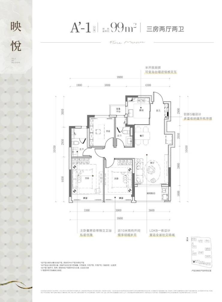 该边套户型,不仅有270度的采光视野,主/次/客卧三大开间并立朝南,“含阳光量”十足。