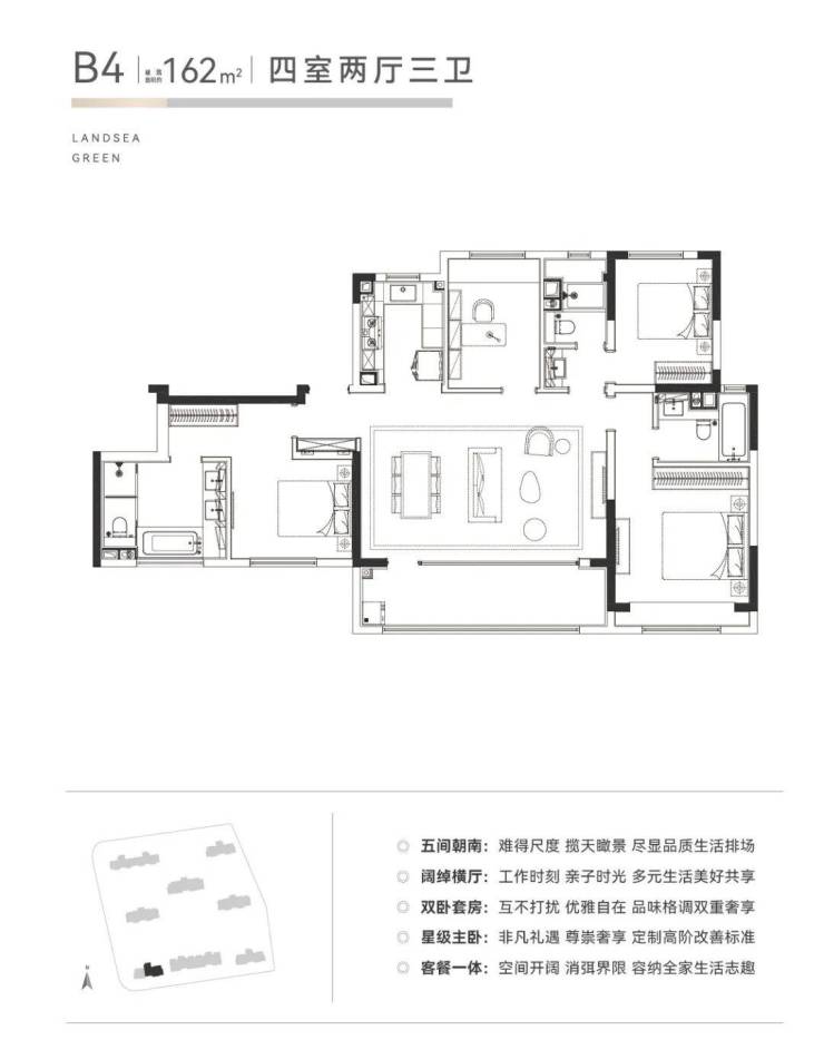 建面约123-216㎡精装科技华宅,于全球范围内甄选高品质精装品牌,同时围绕“恒温,恒湿,恒氧,低噪,适光”五大健康理念,以十大核心科技系统为辅,为居者打造最前沿的舒适智慧家。