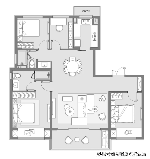 平层户型是小面积里最常见的户型,适合普通家庭居住。是指一套房屋的厅、卧、卫、厨等所有房间均处于同一层面上。