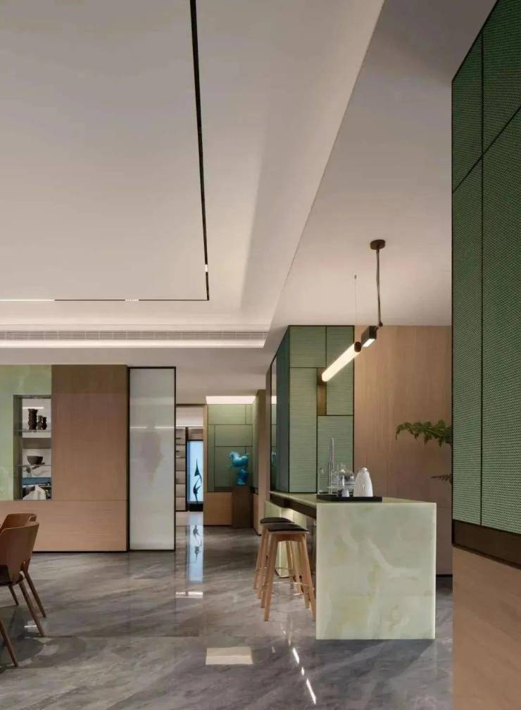 东区建面约320户型,将艺术感进一步融入日常中。特别设计的专属门厅空间,是从电梯厅延伸到家,如同一处艺廊,放慢人的情绪;室内选用了浅金色奢石(外界也称其为“芬迪白大理石”)作为主要的石材,曲面的木饰面也为浅色,整体给人以明亮感。