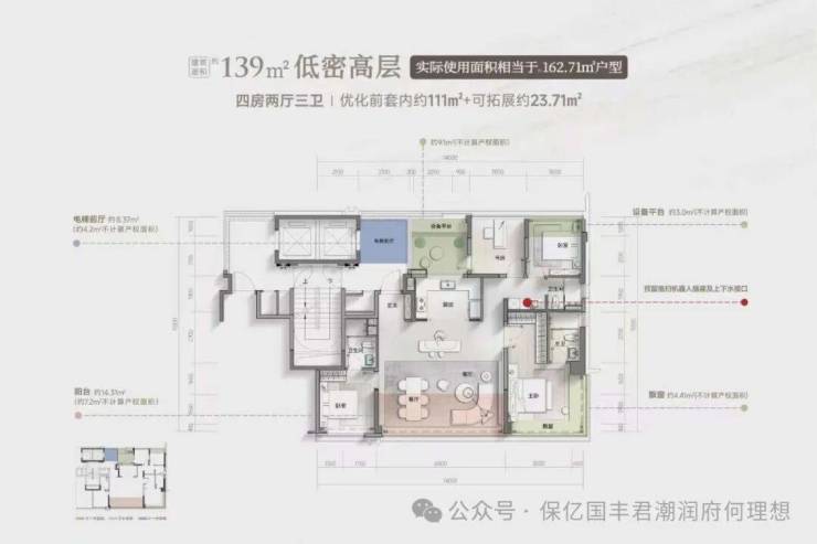 139㎡四房两厅三卫:【实现岛台空间+4房+1功能房】功能升级,实际面积相当于市面上在售160㎡使用面积