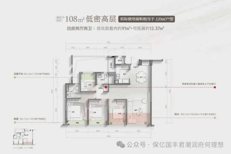 108㎡四房:世纪城唯一小面积四房设计,全明卫+四开间朝南,实际面积相当于市面上在售120㎡使用空间