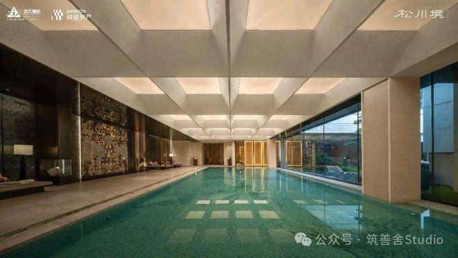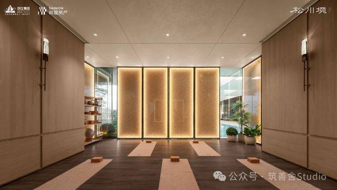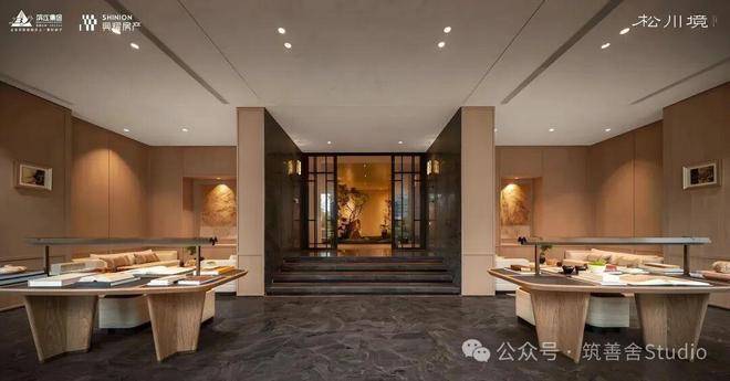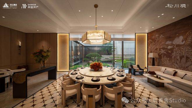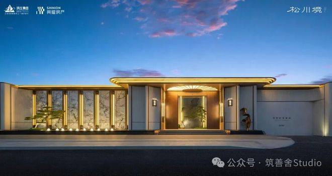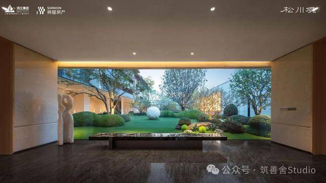 大门徐徐开启,步入序厅,眼前豁然展现《松阁观潮图》所蕴含的“动静相依”东方美学意境。定制套石的龙粼照壁在波光粼粼中熠熠生辉,构筑起松川境独有的文化印记与精神象征。松之静谧与潮之壮阔在此完美融合,每一步都隔绝了门外的喧嚣,实现了从纷繁世界到宁静家园的优雅过渡。